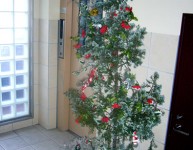 毎年クリスマスツリーは、いきいきリビングに飾る他、1階のエレベータ横にも飾っております。この写真のツリーは、いきいき舎が現在の常盤平陣屋前に越してくる前、お庭に植えて育てていた小さな松の木で、鉢に植え替えて一緒にお引っ越ししてきたものです。
